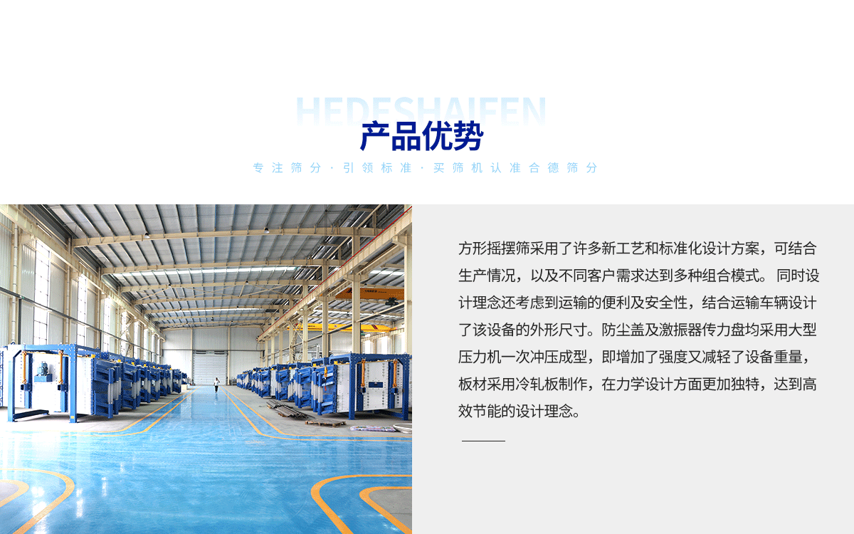 方形摇摆筛驱动装置所产生的振动力是—绕定轴方向呈一定规律变化的惯性力,其本质是有偏心轮绕定轴转动所形成的往复惯性力。筛机启动后,筛机揺动体即筛箱在惯性力的作用下做前后往复运动,筛箱带动筛面做周期性摇动,从而使筛面上的物料随筛箱一同做定向跳跃式运动,期间,小于筛面孔径得物料通过筛孔落到下层,成为筛下物,大于筛面孔……